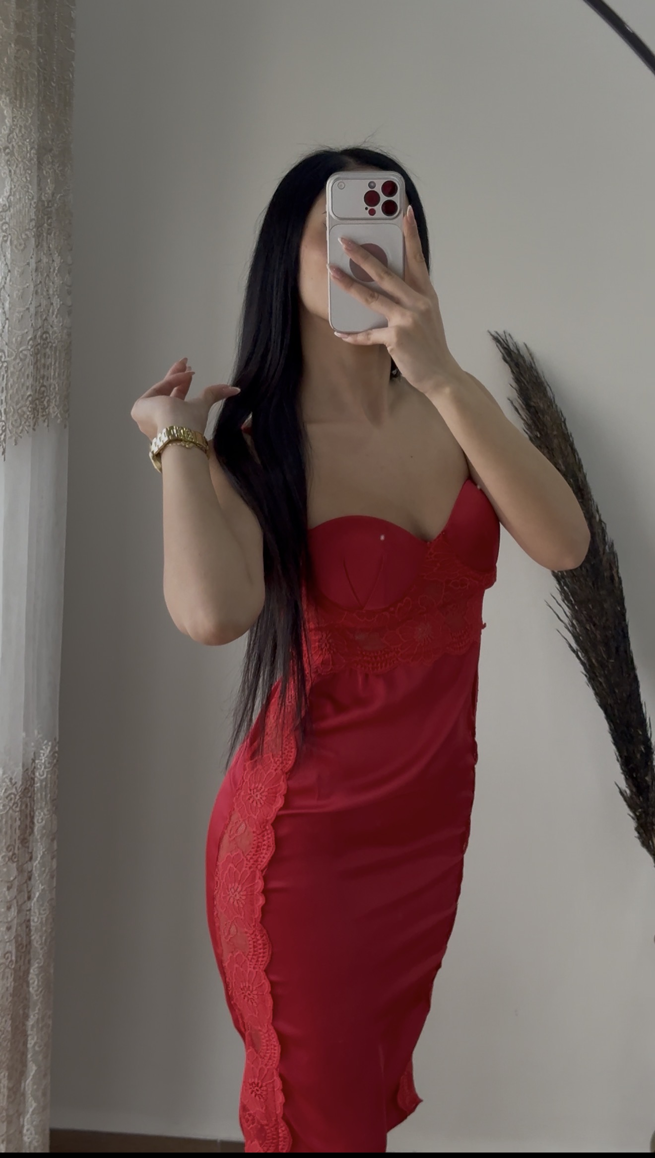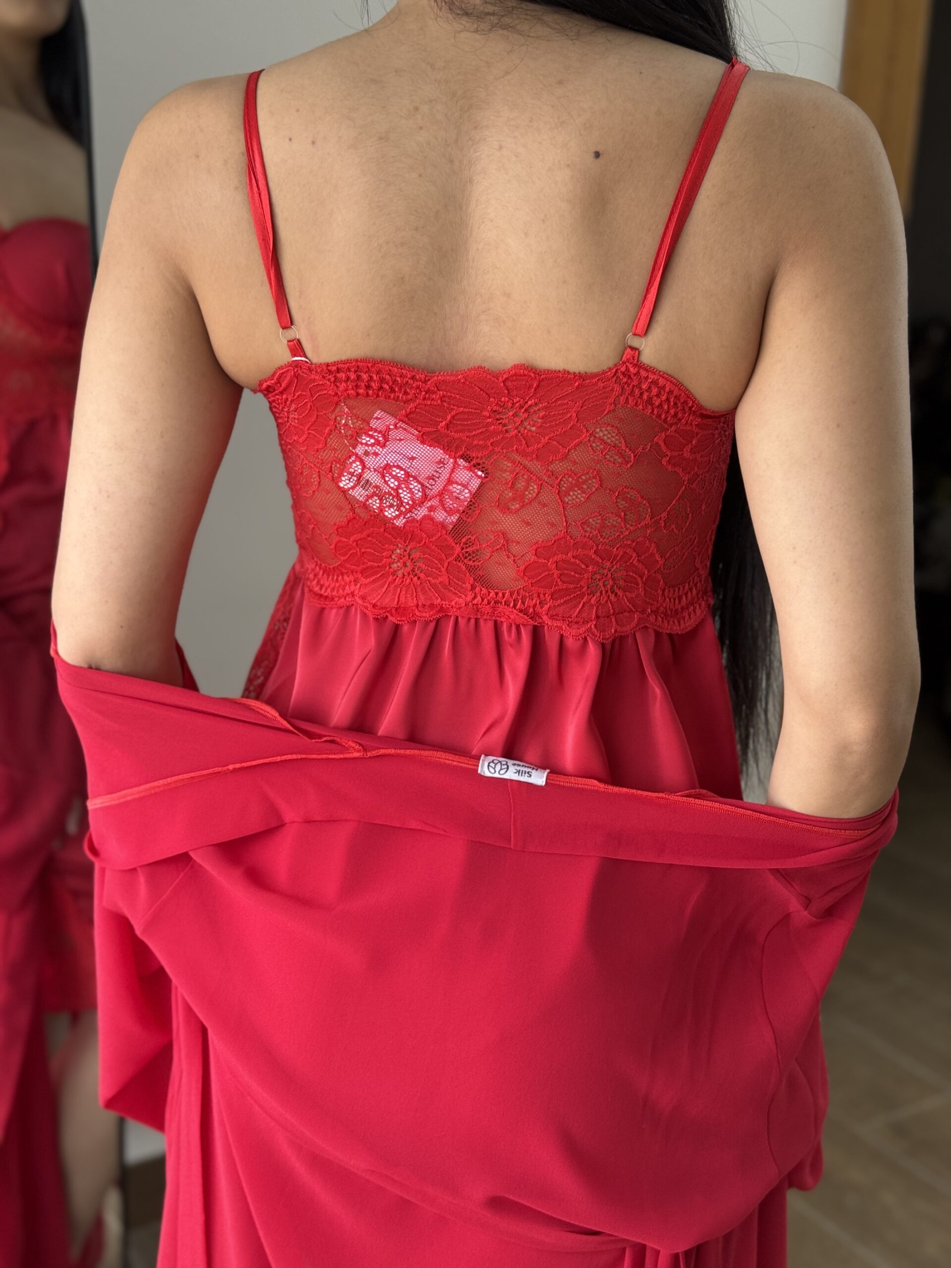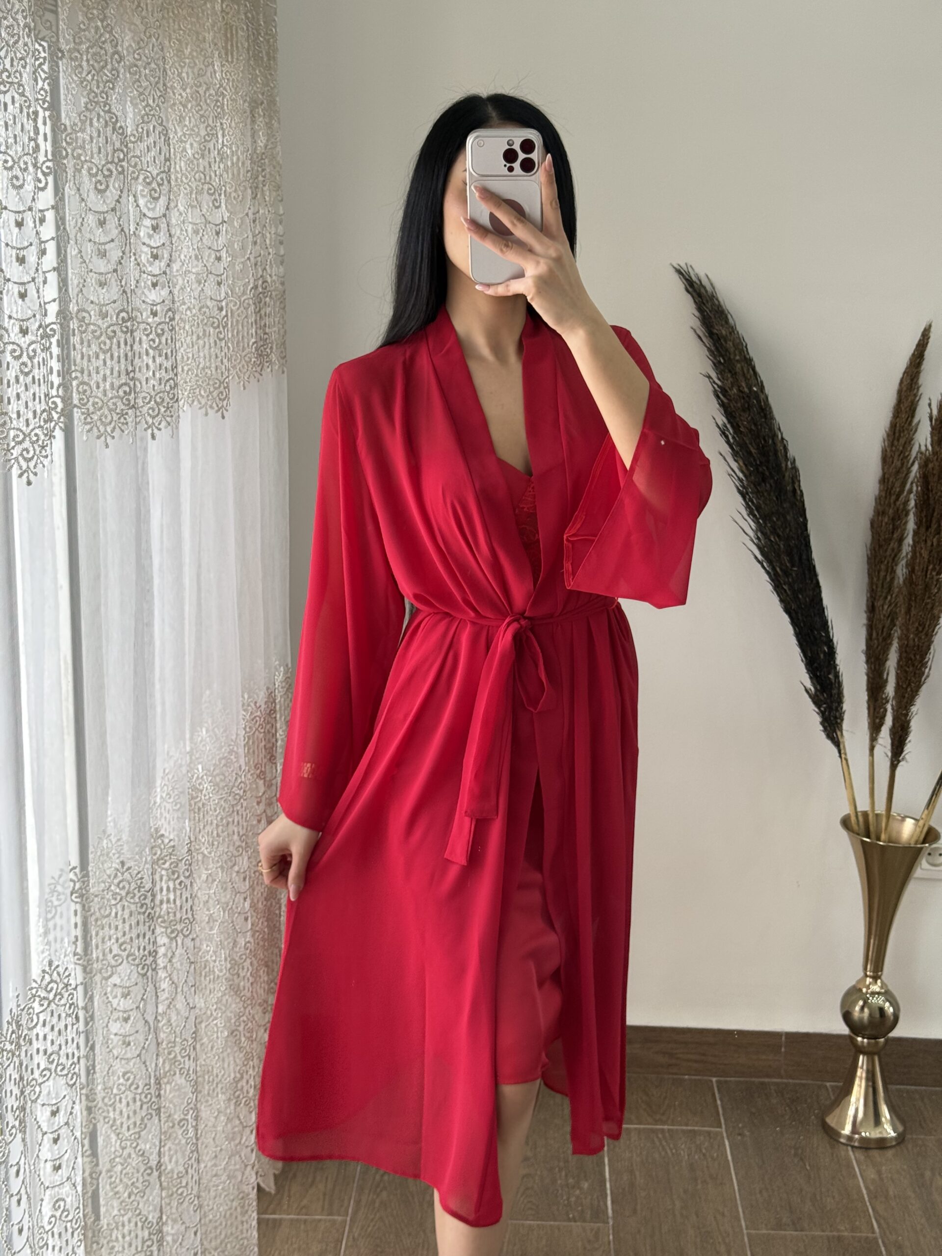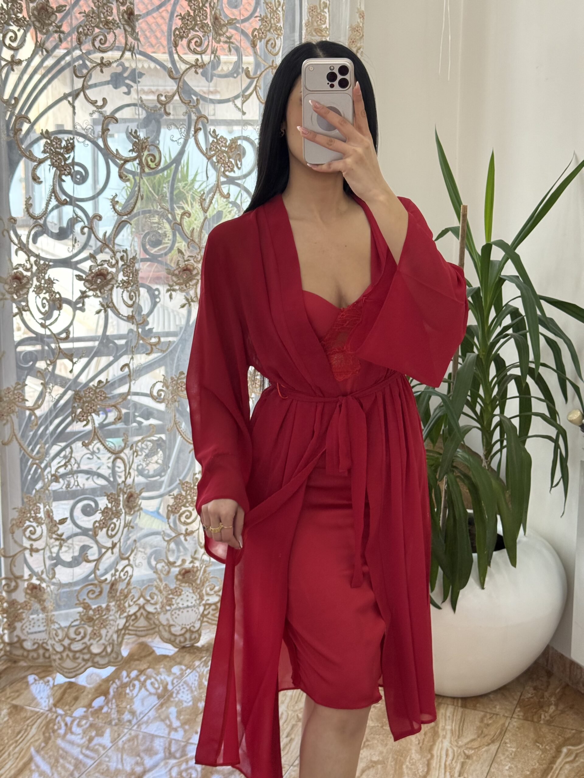 kimono en mousseline longueur 1,150m manches envasées, longueur nuisette 1m dotée de bonnet avec armatures, le dos en dentelle soft et sexy; une dentelle sur les cotées de la nuisette pour un effet moulant et transparent. ROUGE SANG